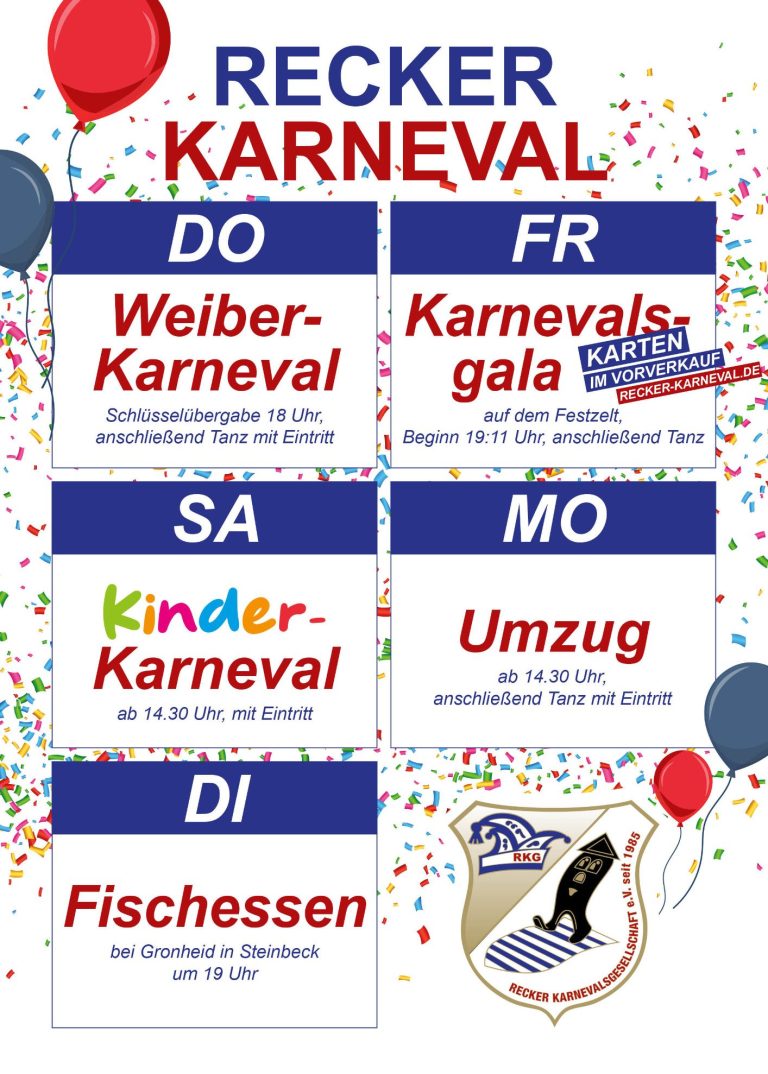 Am 12.02. um 18 Uhr geht es im Recker Rathaus wieder richtig los. Gestartet wird mit dem traditionellen Rathaussturm und der Schlüsselübergabe mit Bürgermeister Peter Vos. Er muss den Rathausschlüssel und seinen Schlips vor den Recker Frauen verteidigen oder wahrscheinlich sogar hergeben. Mit dabei sein werden natürlich auch die Recker Funken.